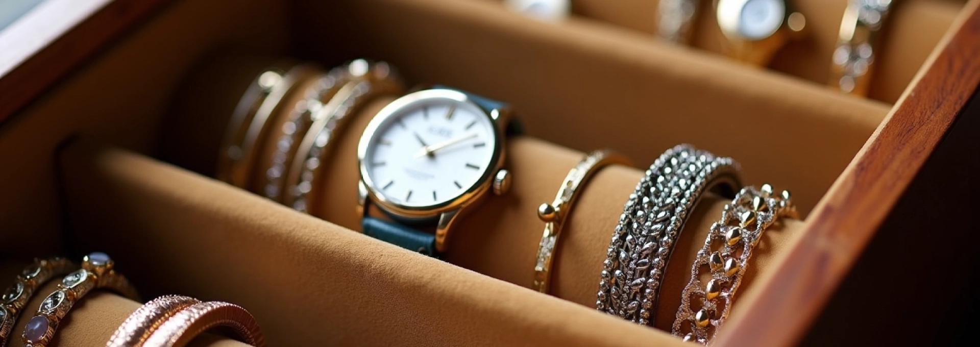 Les bracelets et montres nécessitent un espace de rangement qui les maintient à plat pour éviter les déformations. Des supports cylindriques de qualité ou des coussinets adaptés sont essentiels pour préserver la forme des bracelets souples. Pour les montres, des écrins individuels offrent une protection optimale contre les chocs et la poussière.